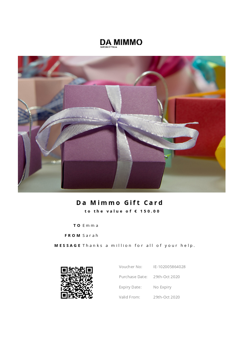 Da Mimmo allows you to purchase instantly printable gift vouchers, special offers and tickets using the Voucher Connect platform.